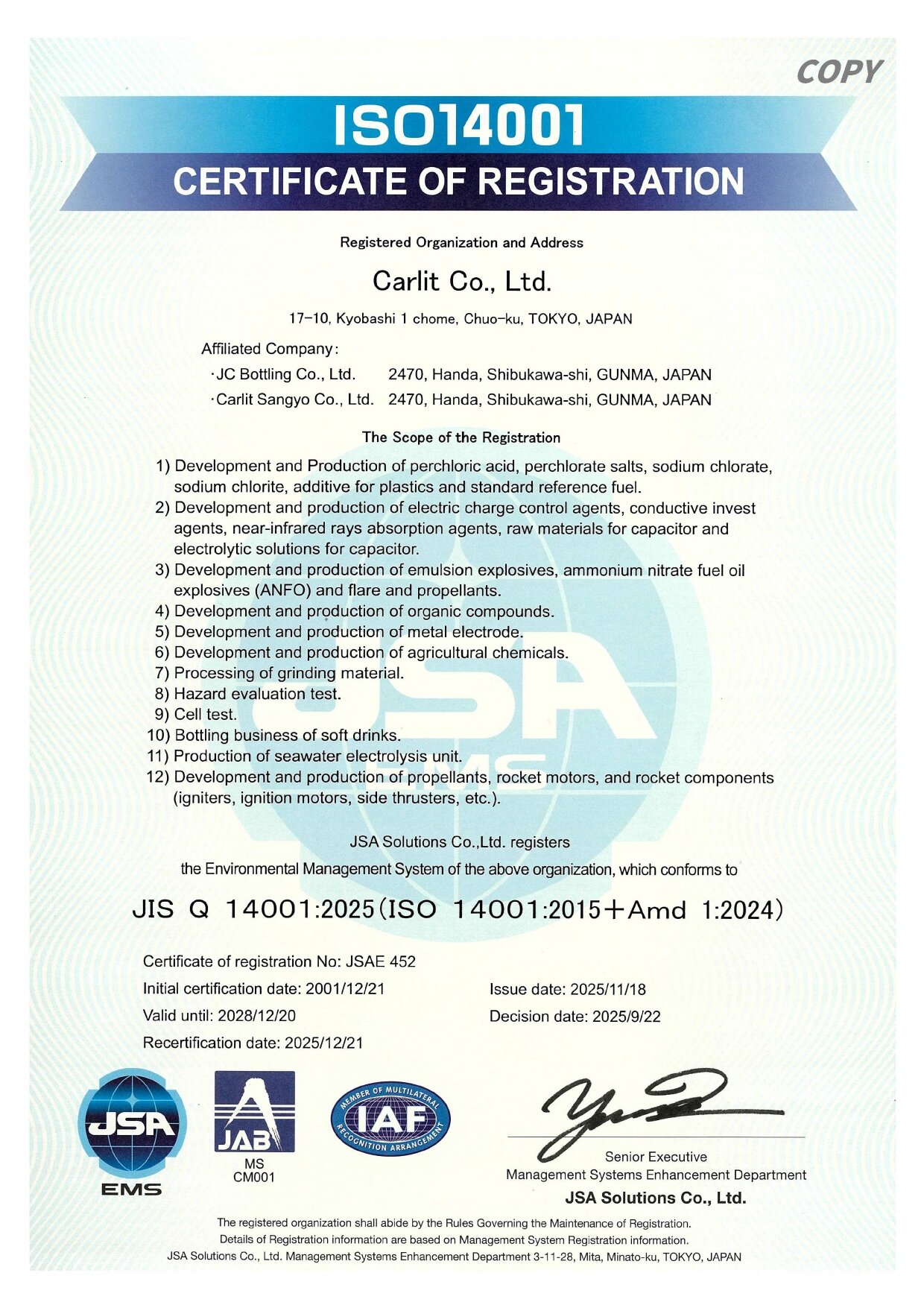 Several of our group companies have obtained ISO 14001 certification, and we are working to raise the bar through our environmental management system. In particular, JC Bottling Co., Ltd. and Carlit Sangyo Co., Ltd., whose business areas are related to our Gunma Plant, have obtained certification as part of the Carlit Co., Ltd. organization and have expanded the scope of their activities to engage in environmental impact assessments.