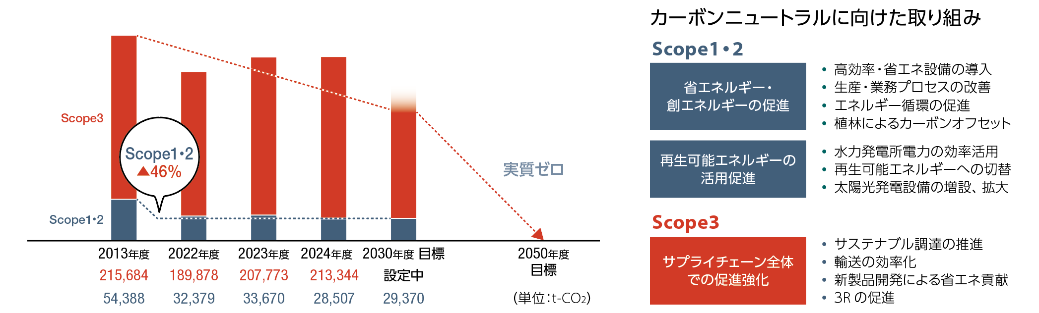 Scope1・2は、そのマイルストーンとして2030年までに2013年度対比で46%削減することを目標として掲げています。目標の達成に向け、省エネルギーの促進、再生可能エネルギーの活用促進、関連するエネルギー使用量の情報開示範囲の拡大に取り組んでまいります。