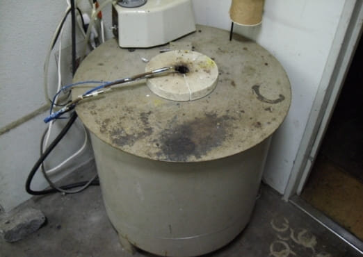 固体物質や粉体物質に対して行われる試験で、火薬類の試験方法として古くから行われている試験です。加熱された鉄製のブロック(坩堝(るつぼ))に少量の試料を投入し、投入から発火するまでの時間を計測します。有機物の場合は気化・蒸発してしまう場合が多く、このような場合は下記に示すASTM式が有効です。