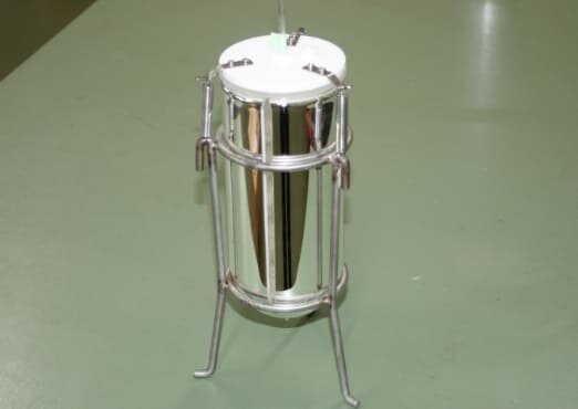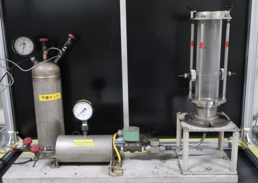 JIS Z8818に規定される試験で、試料をアクリル製の円筒容器に入れ、乾燥空気で円筒内に粉塵を発生させて高電圧の放電で着火します。粉塵爆発が起これば火炎が円筒内を伝播して、上部に取り付けられた破裂板を破裂させます。