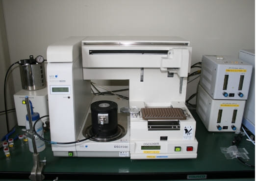 1~2mgの物質を所定の容器(セル)に入れ、任意の昇温速度(通常は10℃/min)で加熱させて試料の熱的な挙動を見ます。方法は開放セルを使用する場合と密封セルを用いる場合がありますが、開放セルの場合は液体だと昇温中に揮発してしまうため、危険性評価では密封セルを用いるのが一般的です。