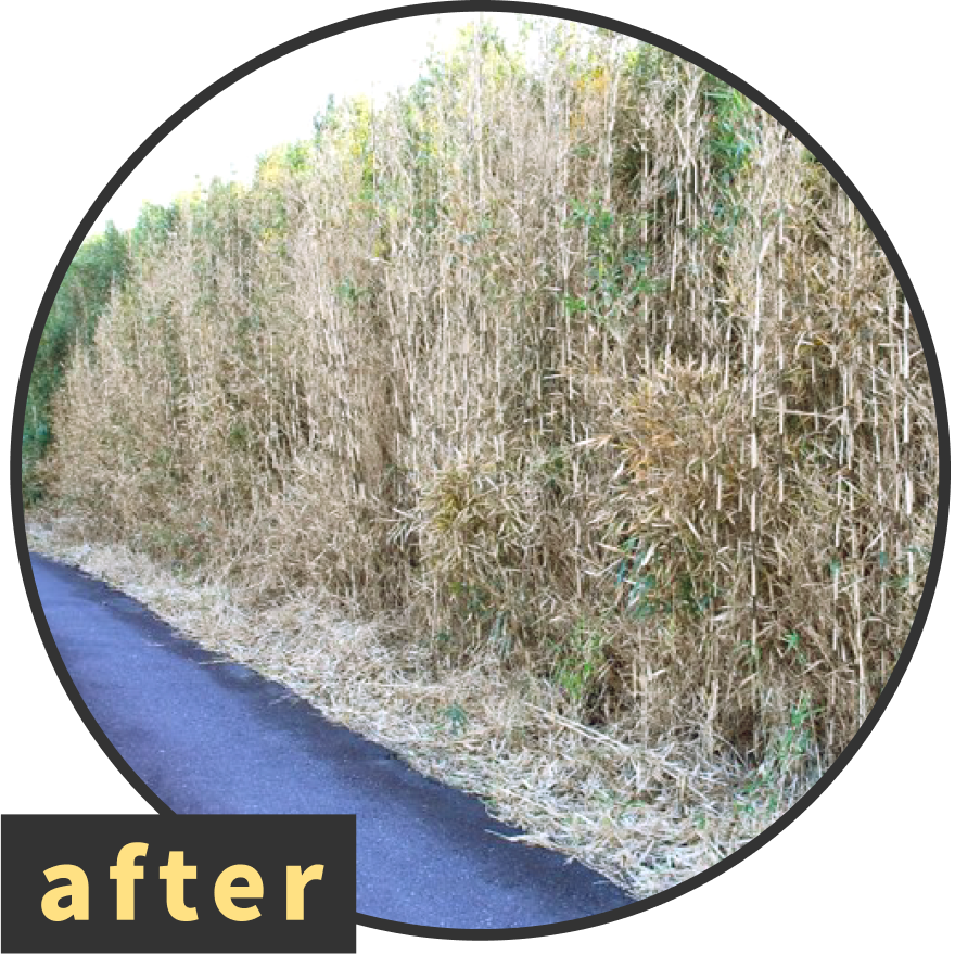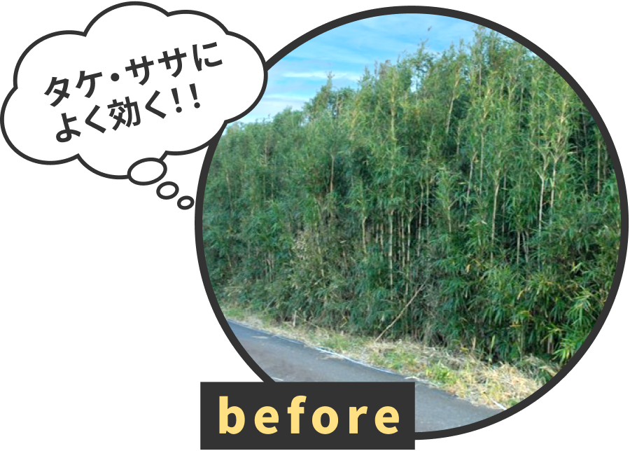 一年生雑草から多年生雑草、雑かん木に至るまで幅広い除草効果があります。特に防除が困難なタケ・ササに対する除草剤として、長年の実績があります。